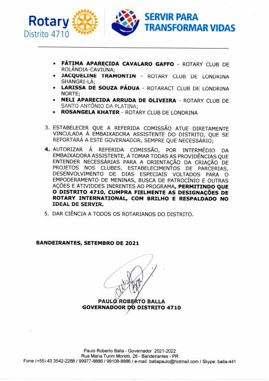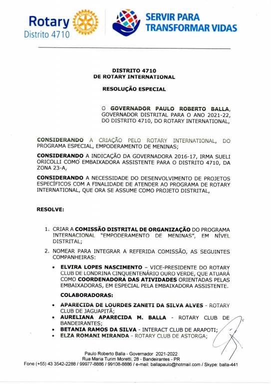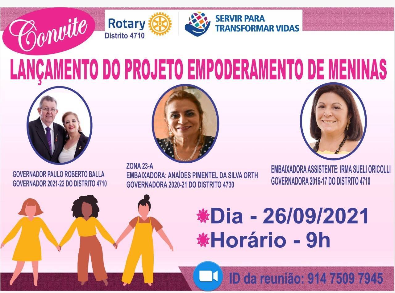 Em evento realizado na forma online, pela plataforma Zoom no último domingo (26), o Governador Paulo Balla decretou oficialmente a criação da "Comissão Distrital de Organização do Programa Internacional Empoderamento das Meninas", como forma de apoiar oficialmente a inciativa do Rotary International em criar esse programa.