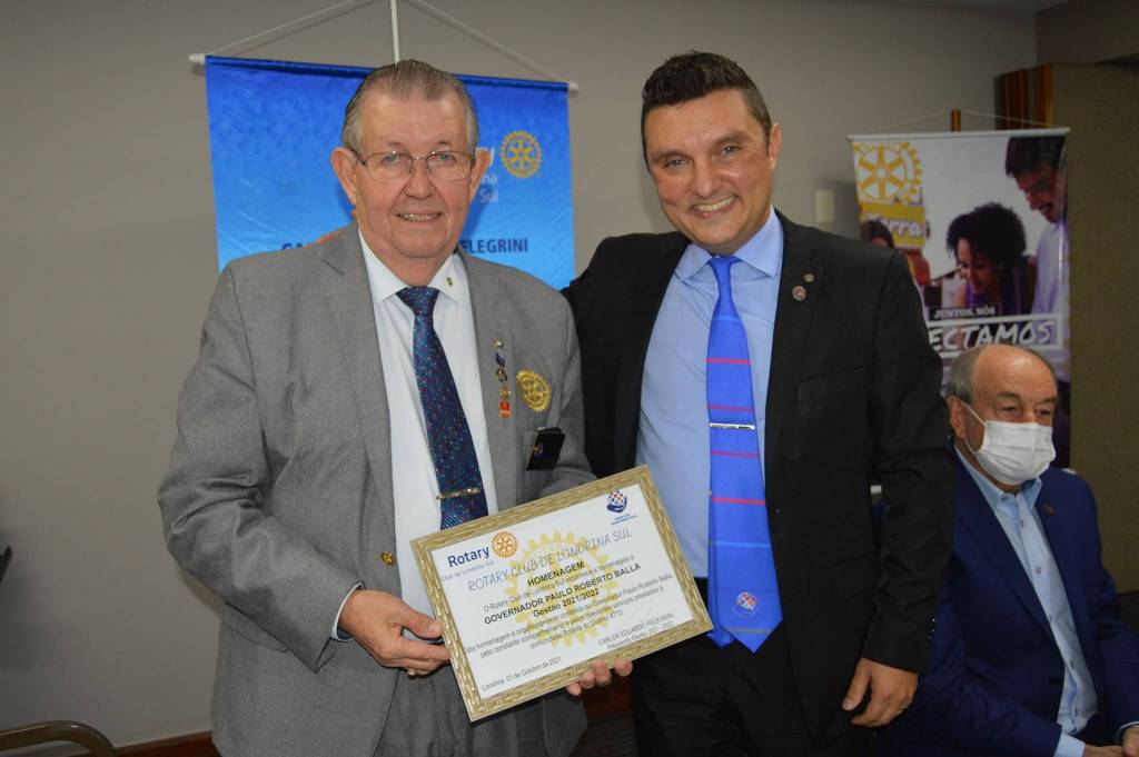 A bonita festiva foi marcada por momentos muito especiais, além da formal visita oficial do Governador Paulo Balla, que felicitou o clube pelos seus 38 anos de fundação, pela bonita e marcante história de inestimáveis projetos e serviços prestados ao município de Londrina e pela brilhante galeria de ilustres rotarianos que prestigiaram sua presidência ao longo dessa trajetória. E o Distrito não foi um mero apêndice nessa bonita história. Exatamente por isso e pelos relevantes serviços prestados até aqui em sua gestão, o Governador Paulo Balla recebeu uma homenagem em forma de certificado das mãos do Presidente Carlos Pelegrini.