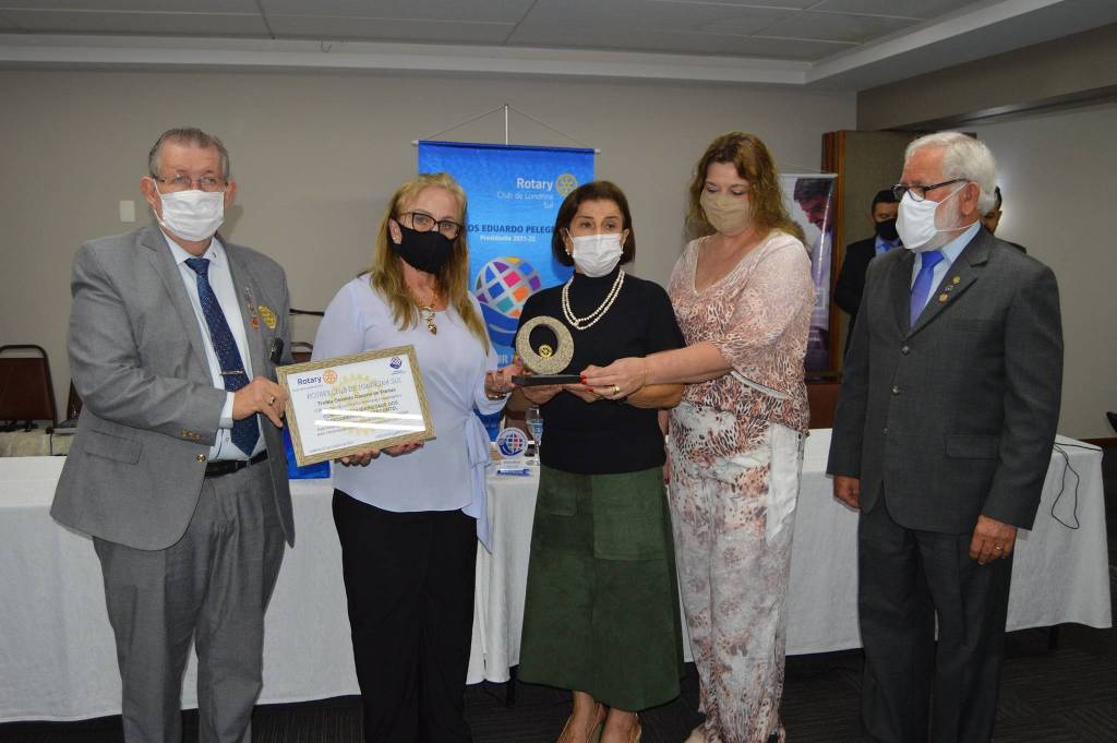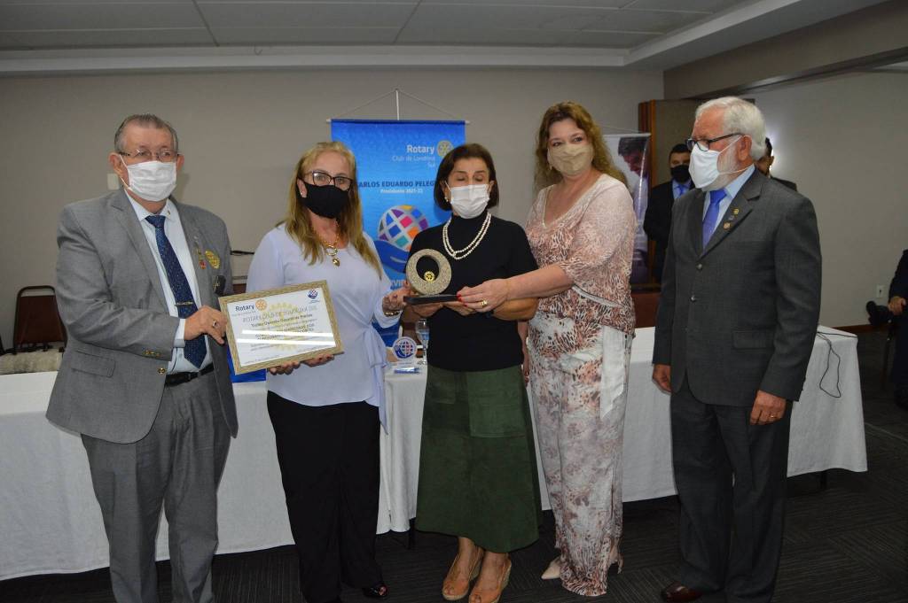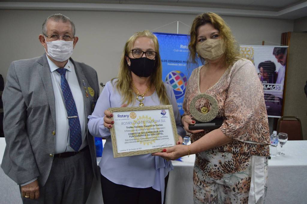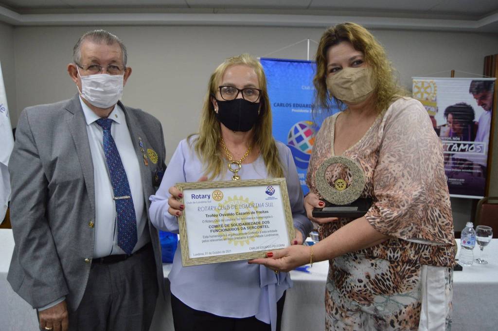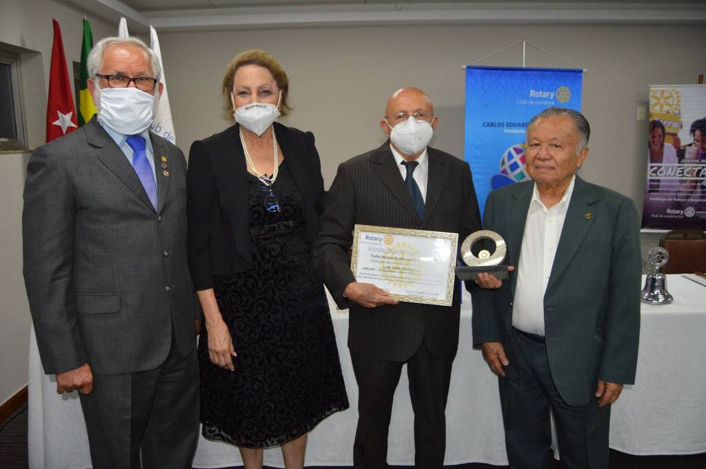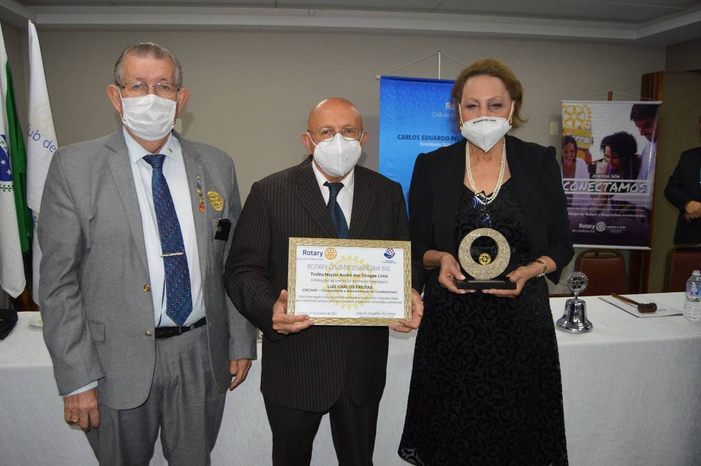 Ainda nos momentos de homenagens, o Presidente Carlos lembrou que em todos os anos o Rotary Club de Londrina-Sul homenageia uma instituição filantrópica e um advogado e/ou um escritório jurídico de destaque na cidade. Os troféus levam o nome e a memória de companheiros que participaram da fundação e história do Clube. Na ocasião os homenageados foram: o Comitê de Solidariedade dos Funcionários da Sercomtel, recebendo o “Troféu Osvaldo Cazarin de Freitas”, na premiação de instituição filantrópica e Luiz Carlos Freitas, da ORCASP – Contabilidade e Administração de Condomínios, que recebeu o “Troféu Naylor André das Chagas Lima”, na premiação de advogado e/ou escritório jurídico.