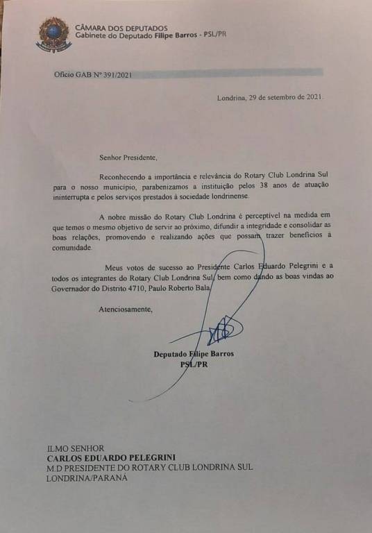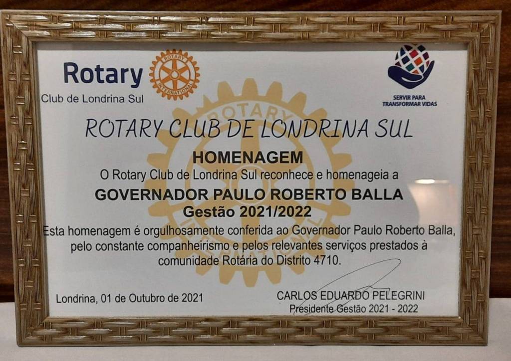 No último dia 01/10, na cidade Londrina, aconteceu a 3ª visita oficial do governador aos clubes de Rotary do Distrito 4710. Nessa ocasião, o Governador 2021/2002, Paulo Roberto Balla, acompanhado de sua esposa, a Cpa Aureliana Aparecida Balla, esteve em visita oficial ao Rotary Club de Londrina-Sul. Na ocasião, a bonita festiva realizada em um dos bem-equipados e agradáveis salões de eventos do Bourbon Business Hotel Londrina, além da visita oficial do Governador, foi marcada por momentos de homenagens e reconhecimentos e também pela data marcante do aniversário de 38 de fundação daquele clube.