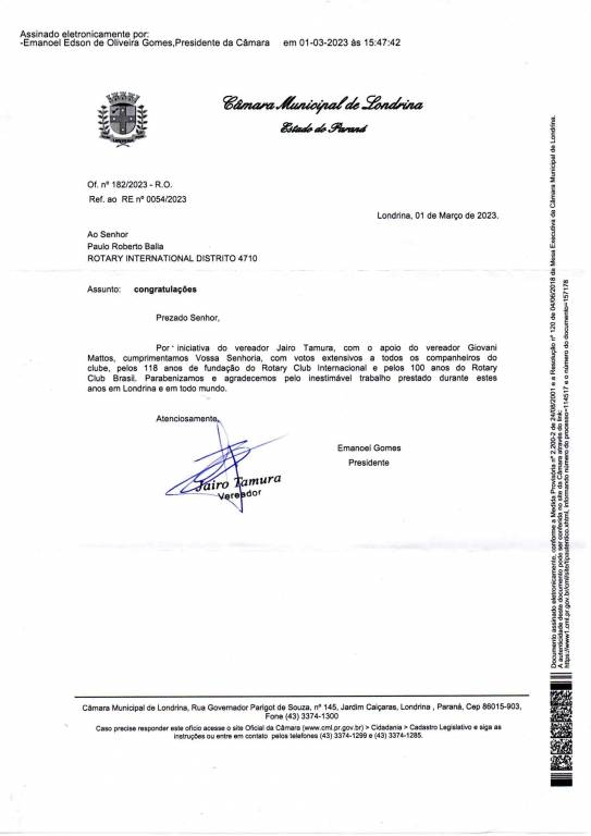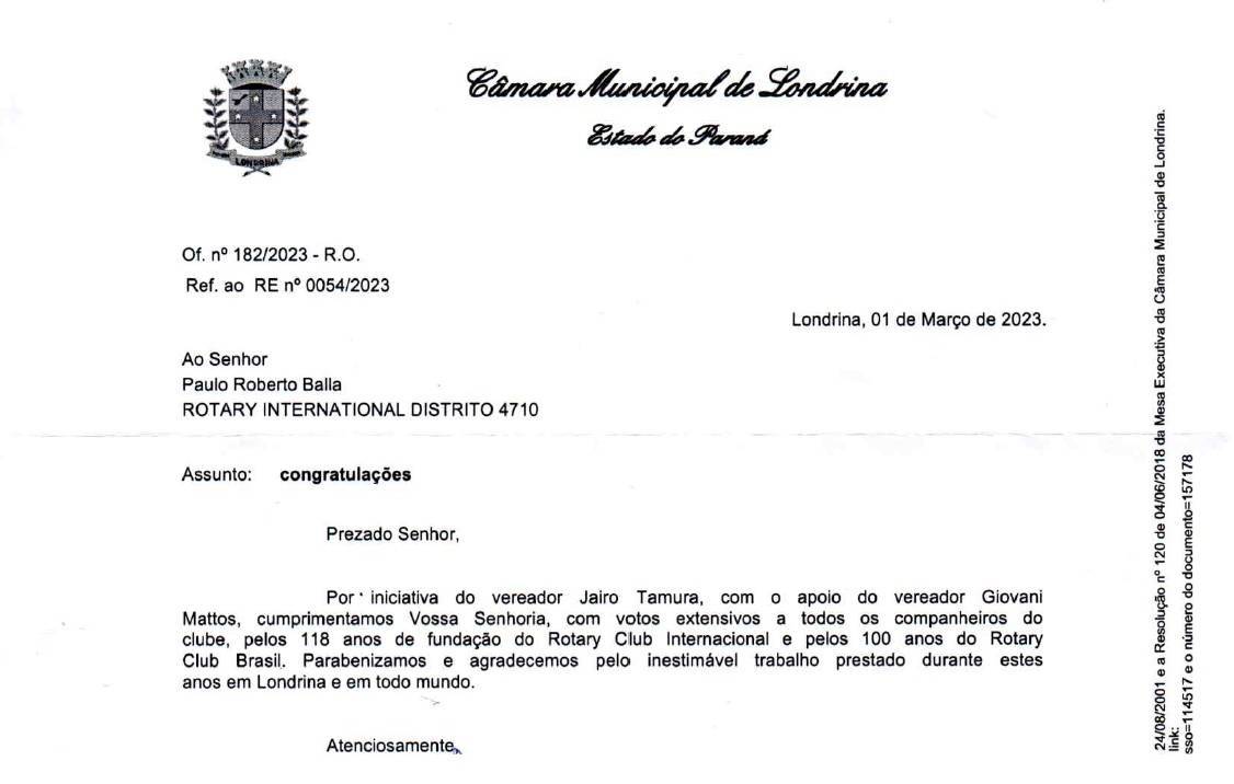 A Câmara Municipal de Londrina, através de seu Presidente, o vereador Emanoel Gomes e do vereador Jairo Tamura, com o apoio do vereador Giovani Mattos, enviou ao Governador 2022-23, Paulo Roberto Balla, um ofício parabenizando o Distrito 4710 e o Rotary Internacional pelos 118 anos de fundação e pelos 100 anos de Rotary no Brasil.