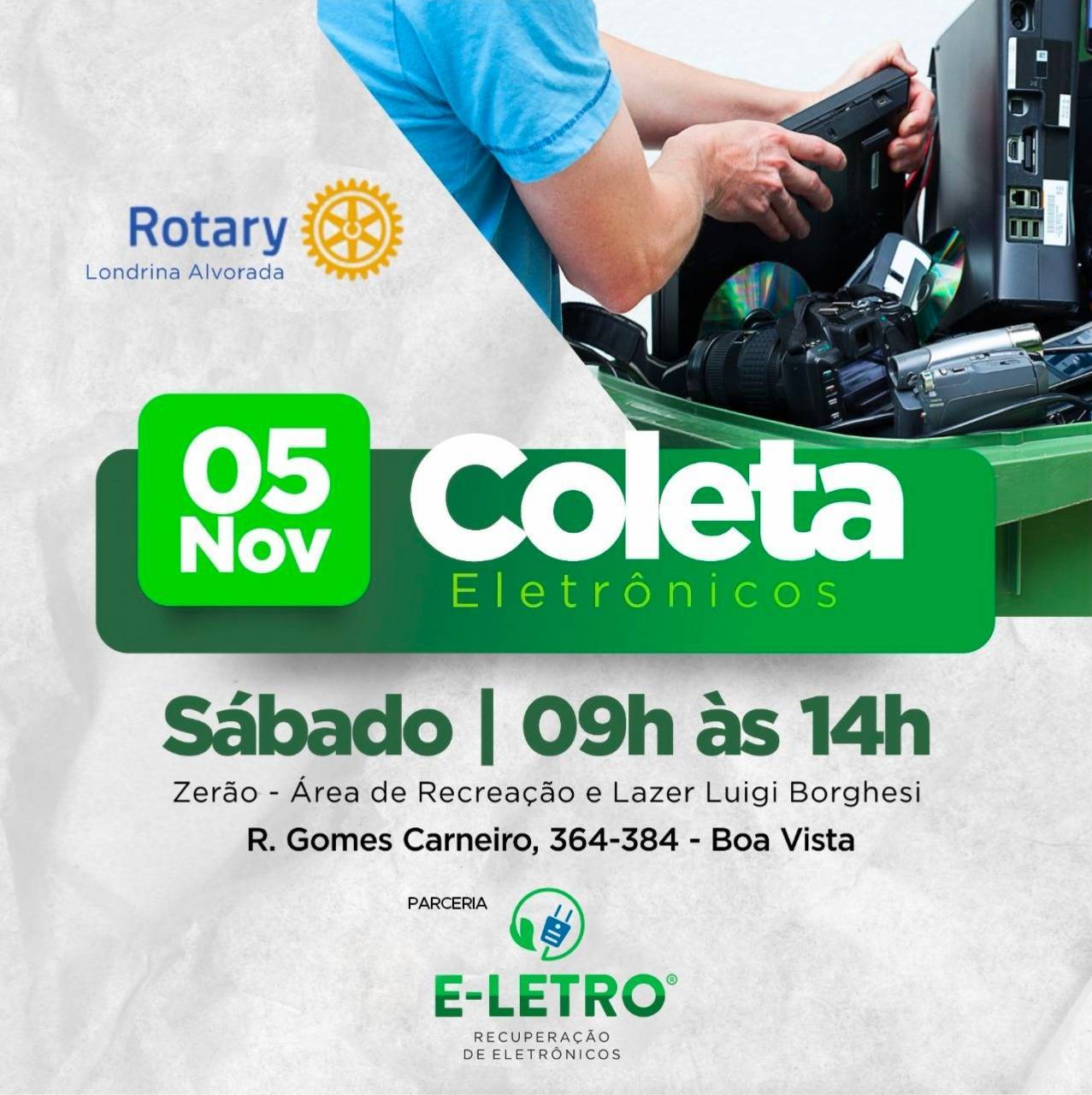 AÇÃO SOCIAL DO ROTARY CLUB LONDRINA ALVORADA EM PARCERIA COM A ONG E-ELETRO COLETA EQUIPAMENTOS E ACESSÓRIOS ELETRÔNICOS EM DESUSO